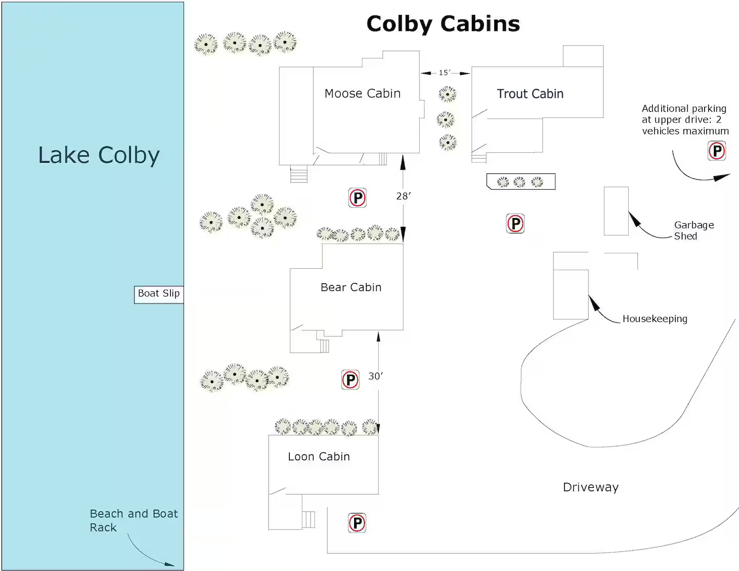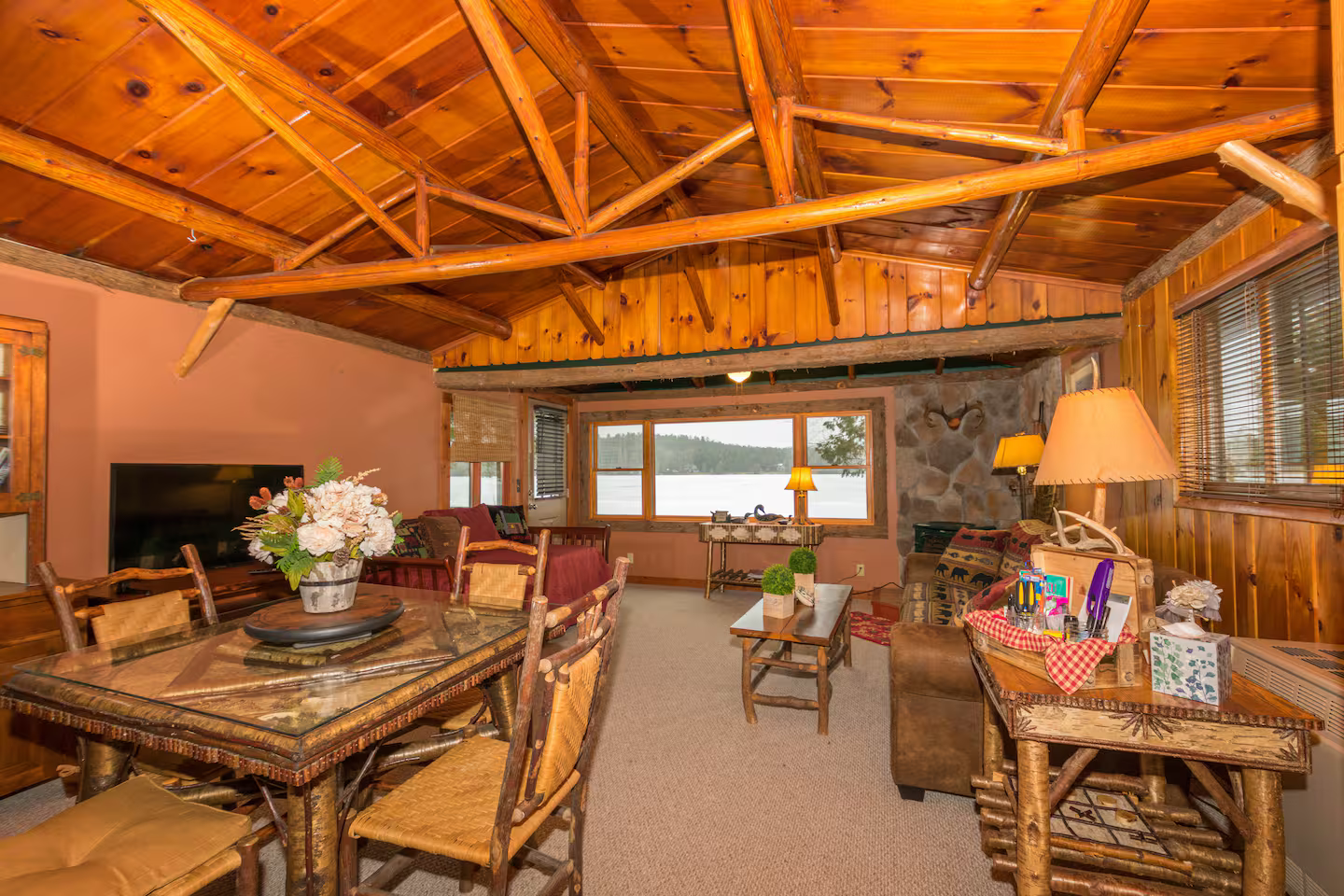 Four charming ADK-style cabins give you the feeling of your own family summer camp, ideal for an extended family get-together. Each cabin is approximately 25 feet from the next, with trees separating them.